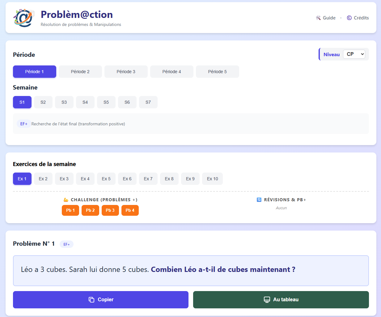 Problèm@ction Résolution de problèmes & Manipulations Retrouvez la banque de résolution de problème dans une application en ligne permettant de les projeter. Accéder au site ici